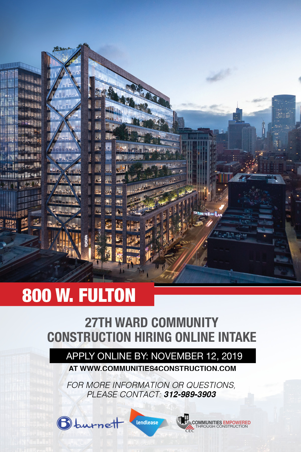 CEC is proud to partner with Lendlease for our new digital intake process. The following questionnaire includes information on The 800 W. Fulton Market project, along with CEC’s vetting process. The questionnaire is designed to be part of your interest application for a construction opportunity with The 800 W. Fulton Market project. Please fill out all of the information in the contact details section along with the questions below. Once you have completed this page, please follow the Thank You page to complete CEC’s online interest form. If you have already completed an online interest form, or are an Approved candidate, no further steps are needed. Both the questionnaire and interest form need to be completed in order to be placed on the list for this project. This questionnaire will only be available until November 12th, 2019