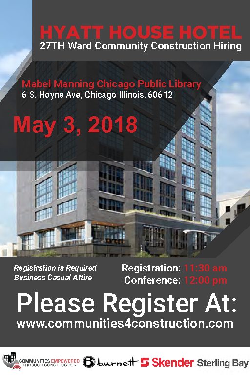 You are invited to participate in a Community Intake Conference for Hyatt House Hotel. This conference welcomes career seeking individuals who are in search of a position in the construction industry.